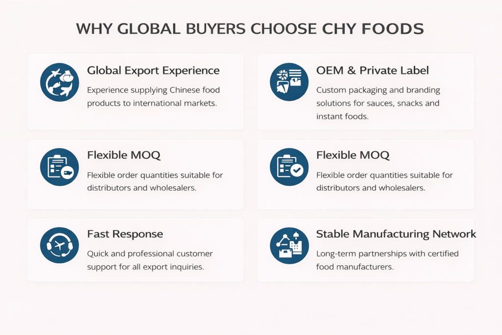 CHY Foods is a professional Chinese food exporter specializing in sauces,