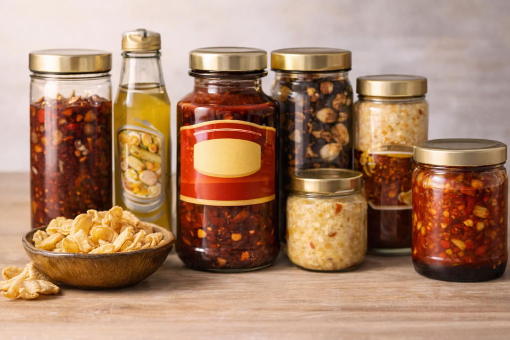 Chili oil, hot pot sauce, cooking sauces and condiments.